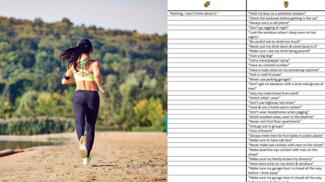 The replies, arranged in a chart, is long and shows the stark contrast between the men, who had nothing to offer, and the women, whose list could go on all day. It includes such typical measures as holding car keys as a potential weapon, avoiding jogging at night, never leaving a drink unattended in public and coming back to drink it, using a male voice on the answering machine, not wearing headphones while jogging, not using parking garages or highway rest areas, not meeting a man in public for a first date — the list goes on. Because this is what we do. This is how we live and how our mothers lived and how their mothers lived — this is normal.