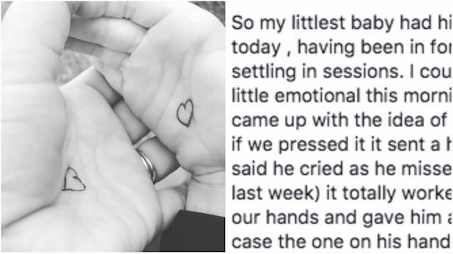 “I could tell he was feeling a little emotional this morning so we had a chat and came up with the idea of having a heart each and if we pressed it it sent a hug to the other one (he said he cried as he missed me on his first half day last week) it totally worked,” she writes.