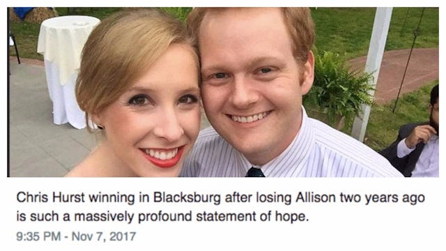 Hurst announced his candidacy in an op-ed for the Daily Beast. “Going into the newsroom each day began to numb me to the humanity on which I was supposed to be reporting,” he wrote. “Even as I connected with people in a new, profound way on TV, I was becoming a shell. The man Alison loved began to fray at the edges. That man is being made whole now with my dedication to the service of the people who supported me during my sorrow.”