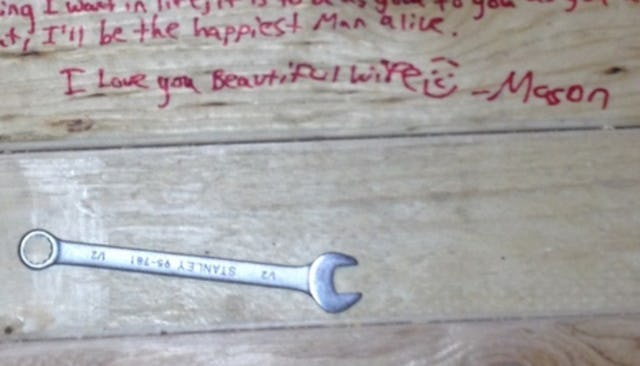 The note is written on the underside of a workbench his father made for his mother to use while she worked on metal engraving projects. He wrote it probably never knowing if his wife would see it, but from his words, you know that didn’t matter to him. He wrote it because he meant it and wanted to say it. Her finding it, especially after his death, was just a beautiful bonus.