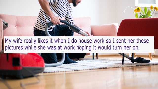 “My wife really likes it when I do house work so I sent her these pictures while she was at work hoping it would turn her on,” he wrote next to some, um, pictures of him in various stages of cleaning, including but not limited to doing laundry (and a large load at that), washing the dishes, and vacuuming — though it may be easier if the vacuum was actually plugged in. Oh wait, I guess he noticed that part.