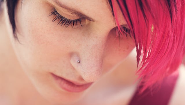 My true self wears her hair super-duper short and dyes it an unnatural red color. In the summer it is styled as a faux hawk.