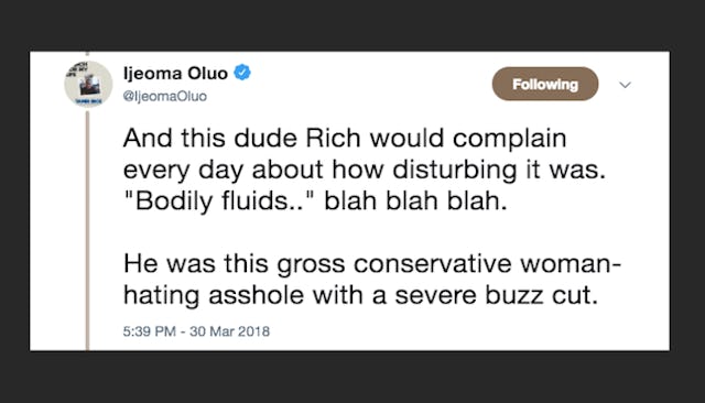 Oluo’s story takes place awhile ago, back before workplaces were required to offer designated, sanitary places for breastfeeding employees to pump (spoiler alert: we’ve still got a long way to go on that one, even in 2018). The content of her thread, however, is extremely relatable.