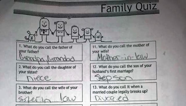 The worksheet starts out straightforward enough, with questions like, “What would you call the father of your father?” (Grandfather) and “What do you call the son of your parent? (Brother). It then branches out to address titles divorced and/or blended families might encounter, such as “What do you call it when a married couple legally breaks up?” (Divorce). So far, so good.