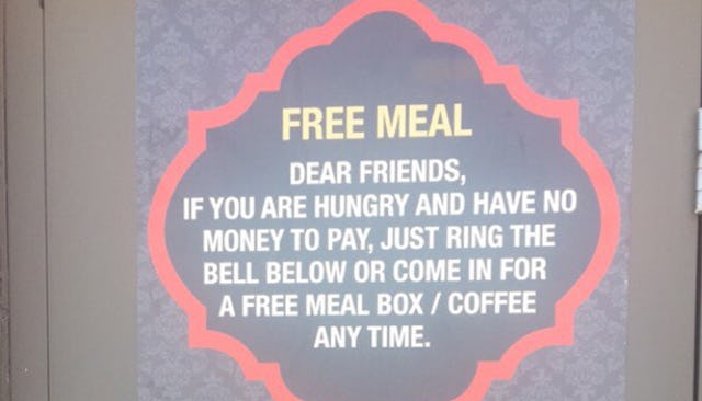 It reads, “Dear friends, If you are hungry and have no money to pay, just ring the bell below or come in for a free meal box/coffee anytime.” Below this kind offer are the choices — a vegetarian or non-vegetarian meal and choice of drink.