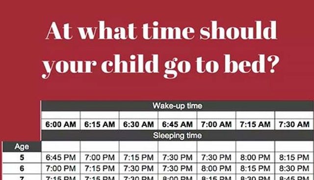 I may just be speaking from a place of jealousy, because my kids don’t sleep. But 6:45 p.m.? Most working parents have barely finished work and fed the kids by then. How do parents adhere to a schedule like this? Do tell. Also, I love how ages five through eight just cap out at 9 p.m. If your kids don’t go to bed by then we’re not even talking to you. You’re hopeless.