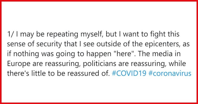 “This is the English translation of a post of another ICU physician in Bergamo, Dr. Daniele Macchini. Read until the end,” wrote Silvia Stringhini, an Italian epidemiologist also working in the coronavirus epicenter, on Twitter. “After much thought about whether and what to write about what is happening to us, I felt that silence was not responsible. I will therefore try to convey to people far from our reality what we are living in Bergamo in these days of Covid-19 pandemic. I understand the need not to create panic, but when the message of the dangerousness of what is happening does not reach people I shudder.”
