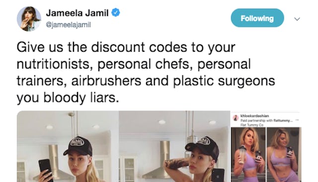 Jameela Jamil, best known from the popular TV show The Good Place, is taking to her Twitter and Instagram pages to directly address celebrities like Khloe Kardashian, Iggy Azalea, and Cardi B for implying they have the bodies they have by drinking detox tea.