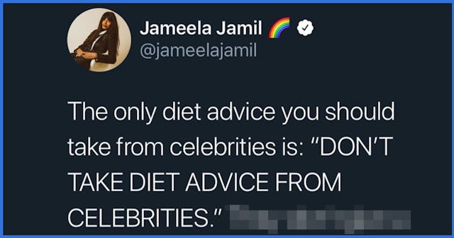 “The only diet advice you should take from celebrities is: ‘DON’T TAKE DIET ADVICE FROM CELEBRITIES,'” Jamil wrote. “They don’t give a flying fuck about you, or your kidneys or your liver or your mental health. Unfollow, delete, repeat.” Yup, that sounds about right.