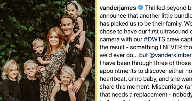 Last night on Dancing with the Stars, actor James Van Der Beek revealed that he and his wife, Kimberly, are expecting their sixth baby. While announcing that another child would be joining their brood on the live TV show was already a pretty big moment, the star also used the opportunity to talk about something else that we definitely don’t hear enough about: miscarriage.
