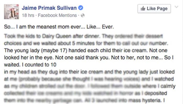 After ordering ice cream at Dairy Queen with her three kids, “The young lady (maybe 17) handed each child their ice cream. Not one looked her in the eye. Not one said thank you. Not to her, not to me…” Primak Sullivan said she waited for her kids to acknowledge the worker and when they headed outside instead she calmly followed them out and rounded up the ice creams, then tossed them in the trash without uttering a single word. Once her kids got over the expected hysterics, they calmed down and she told them why she had just thrown away their barely eaten treats. “I explained that one day, if they were lucky, they would work a job like that young lady. And I would hope that people would see them. Really see them. Look them in the eye and say thank you.”