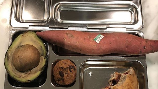 This is obviously not the actual lunch that Sid got for school — the yam completely prevents anyone from closing the lunchbox’s lid — but it sure did resonate with over 46,000 people who have dealt with the impossible lunchbox dilemma before school five days a week.