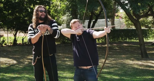 After some back and forth, they decide to have Corden ride in a side-car, which was definitely the right call. “I’m Jason Momoa’s side-piece,” Corden said, clearly relieved he didn’t have to actually be in the driver’s seat. After riding around town for a bit, the duo decided to try some limb archery. Momoa, who said his wife, Lisa Bonet, got him into it, said they have a tomahawk course at their home with targets and bows and arrows. “I’ve never felt like less of a man,” Corden said. As you should.