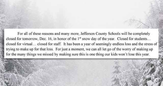 Superintendent Bondy Shay Gibson sent a letter home to parents Tuesday night in preparation for the huge snowstorm currently unfolding in the Northeast. Despite the fact that Jefferson County Schools are all virtual right now, Gibson believes the school community is still entitled to a good, old-fashioned snow day. The letter will undoubtedly bring you to tears, so be prepared.