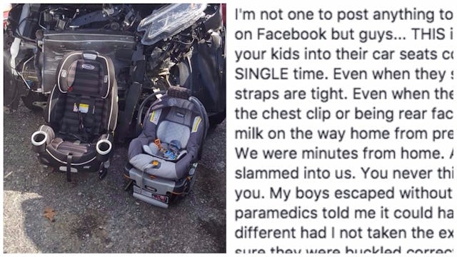 “I’m not one to post anything too heavy or personal on Facebook but guys… THIS is why you buckle your kids into their car seats correctly every SINGLE time,” she writes.
