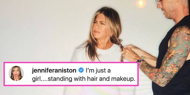 Last week, Jennifer Aniston broke the internet when she finally, after a million years, decided to bless us with her presence on Instagram. Her first post was a totally clever Friends reunion snap, featuring the entire gang from the legendary sitcom. Each of her posts and stories since have been totally hilarious and on point. Seriously, the woman is even funnier than we could have imagined. On Monday she struck gold on the ‘Gram again, sharing a totally transparent, behind-the-scenes look at what it takes to get her glammed up for the pages of a glossy magazine.