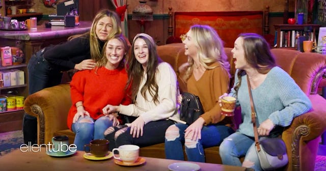 Since Aniston happened to be in the neighborhood, she decided to swing by her old caffeinating hole — and it made for the perfect skit. Here’s how it went: a group of unsuspecting fans would be ushered onto the couch, handed a faux cup of java, and on the cue “lights, camera, and latte,” were expected to smile for the camera. Only instead, Aniston would jump out and surprise them.