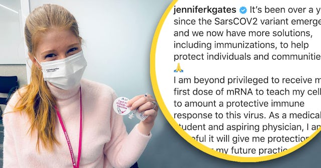 Bill Gates’ daughter, Jennifer Gates, is a medical student who recently received her first dose of the COVID-19 vaccine. Like many people who have received the vaccine, she shared a photo of her post-shot — but hers was a little…different compared to her vaccinated counterparts. Because her dad has been at the center of one of the most inexplicable conspiracy theories perpetuated by COVID deniers since the onset of the pandemic.