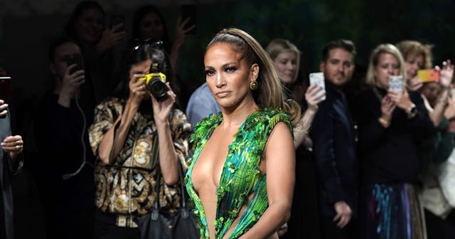 Once upon a time, a little-known star named Jenny from the Block wore a green Versace dress with a plunging neckline to the Grammy Awards in 2000, and it was nice. Just kidding, J.Lo’s now-iconic green Versace dress broke the damn internet! When J.Lo stepped onto that red carpet all those years ago with what was essentially a sheer green Versace pool cover-up, she was instantly anointed “queen” status. Cut to today and J.Lo has proven that she is literally incapable of aging because the 50-year-old star closed the runway at Versace’s spring 2020 show in Milan on Friday night in a re-imagined gown that mimics her iconic Versace dress.