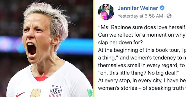 “’Ms. Rapinoe sure does love herself,’” Weiner wrote on Facebook. “Can we reflect for a moment on why that’s an insult? A thing some men want to slap her down for?”