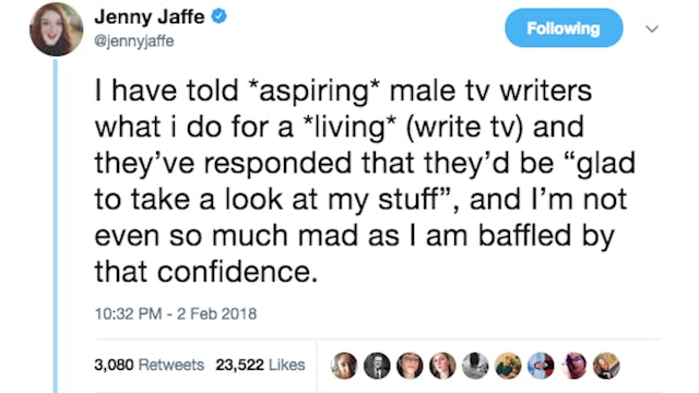 Sigh, if only we all could have the confidence of an overly confident man. TV writer Jenny Jaffe (a delightful Twitter follow, 12/10 highly recommend) recently shared an encounter she’s had with multiple men who are aspiring TV writers. Most people would probably treat someone who works in the industry they hope to work in as a sort of mentor figure, right? Welp, not if you’re these guys.