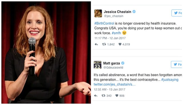 Chastain took to Twitter earlier this month to share how disappointed she was about the Senate’s vote to gut the Affordable Care Act. In addition to taking away health care from millions of children and possibly killing others, the repeal of Obamacare would force millions of women to pay for their birth control out of pocket. “#BirthControl is no longer covered by health insurance,” the Golden Globe-winning actress tweeted. “Congrats USA, you’re doing your part to keep women out of the work force.”