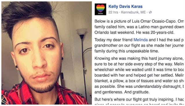 Kelly Davis Karas posted a photo of 20-year-old Orlando shooting victim Luis Omar Ocasio-Capo and wrote that she and her coworkers had the “sad privilege” of attending to his grandmother on a recent flight as she headed to Orlando to be with her family in the wake of this awful tragedy.