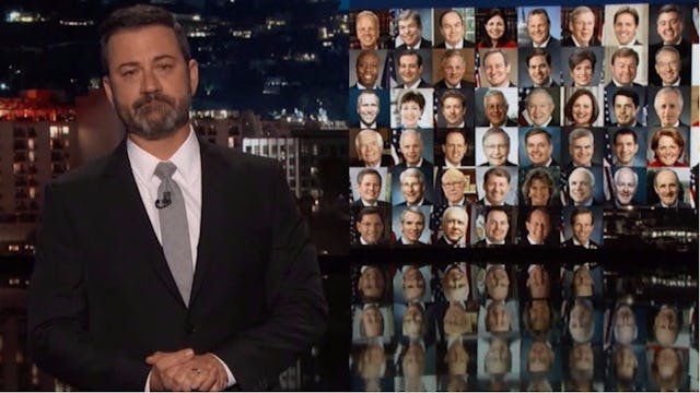 Kimmel went on to say that although 90 percent of Democrats and 77 percent of Republicans (people, not politicians) support background checks at gun shows, and 89 percent of Republicans and Democrats favor restricting gun ownership for the mentally ill, there’s still 56 senators who will not support the bills needed for actual change.