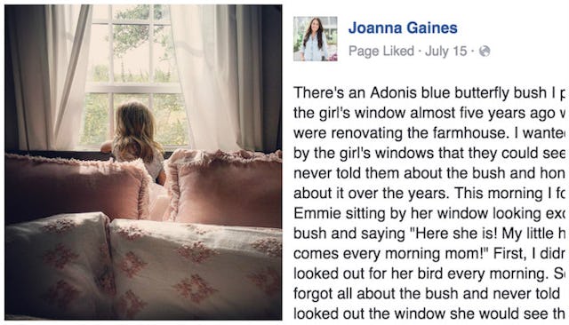 On her official Facebook page, Gaines shared a photo of her daughter looking out the window at an Adonis blue butterfly bush. “I planted [it] by the girls’ window almost five years ago when we were renovating the farmhouse. I wanted butterflies by the girls’ windows that they could see and enjoy,” Gaines explained. “I never told them about the bush and honestly I forgot about it over the years.”