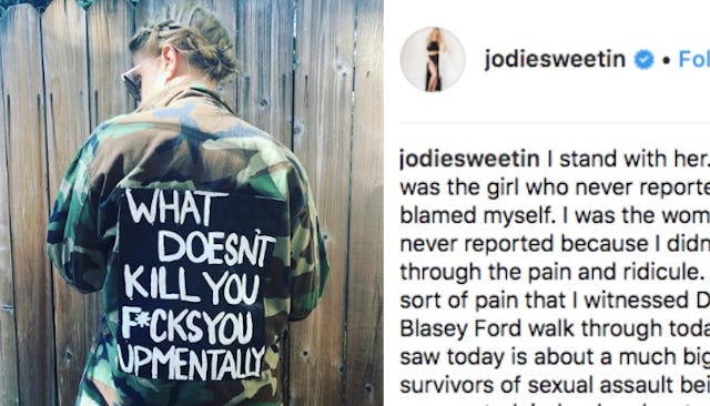 After watching Dr. Ford’s testimony yesterday, Sweetin felt compelled to share a message to her fans about her experience and her feelings. “I stand with her. I AM her. I was the girl who never reported because I blamed myself. I was the woman who never reported because I didn’t want to go through the pain and ridicule,” she writes.