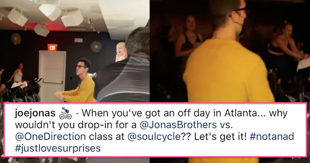 Joe Jonas is currently working in Atlanta, Georgia, so when he had a random day off from work he decided to look for a workout class nearby to take, which is when he saw that Soul Cycle was offering a Jonas Brothers Vs. One Direction-themed class. Joe, a guy who “just loves surprises,” decided to show up at the class and see what happens. Spoiler alert: everyone freaked out.