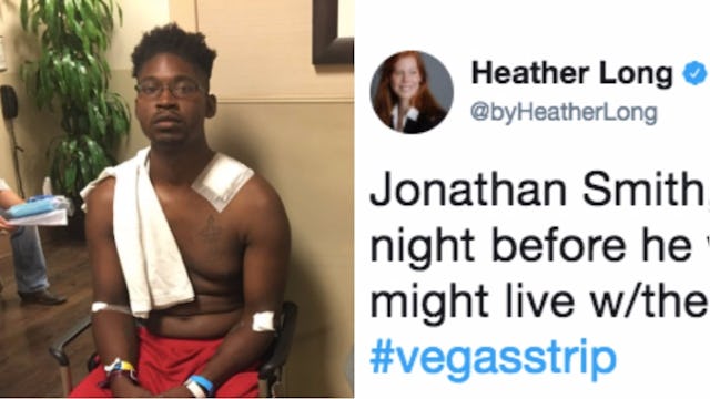 The day after the Las Vegas massacre outside Mandalay Bay, a reporter for The Washington Post tweeted out a picture of a man with a bandage on his neck. Her tweet read: “Jonathan Smith, 30, saved ~30 people last night before he was shot in the neck. He might live w/the bullet for rest of his life.” The tweet quickly went viral, because after Sunday night’s horrific events, we needed to see the heroes.