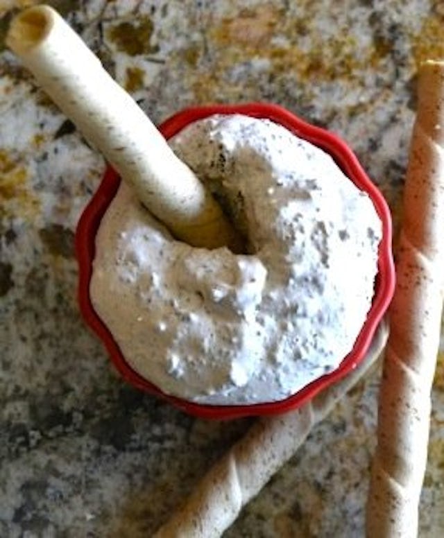 How to make it: Put four Giant Hershey’s Milk Chocolate Bars into food processor (or, hand grate if you have two hours and knuckles to spare.) Mix into 2 tubs of Cool Whip. Add 3/4 cup of Kahlua, adding more to taste. His family served it with Pirouette cookies and that’s all well and good, but I prefer it straight up, mousse style.