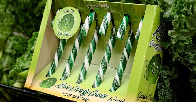 With the beginning of fall comes all kinds of new holiday-themed products that make us yearn for wintertime a bit early. Those frosty mornings, that hot cocoa, fireplaces, and candy canes to rot your kids’ teeth. But unless they really really love kale, like more than Alicia’s kids, they probably won’t want to chow down on these new candy canes because they are, in fact, kale flavored.