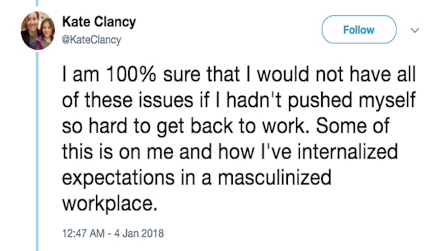 No woman enjoys talking about her medical complications, especially on a public platform. But perhaps because we’re not talking about it more, that’s part of the problem. It’s easy for society — and, more specifically, employers — to forget that giving birth is a massive medical event. One that requires serious recuperation and time for adjustment — which for many women, is no more than six weeks. Or less.