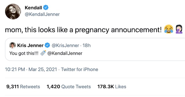 During the show, Jenner appeared to be having a bit of “baby fever,” which makes sense given her siblings having All Of The Babies over the past couple of years. But her mom’s “You got this,” tweet with a baby bottle emoji only made it seem like her daughter was actually expecting.