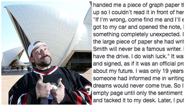 The letter simply reads, “”Kevin Smith will never be a famous writer. He does not have the drive. I do wish luck.” It was signed and dated, “as if it was an official proclamation about my future,” Smith writes.
