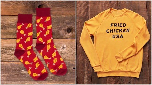 If you’re tired of having to explain your love of fried chicken to people, we’ve got the perfect cure: KFC’s new clothing line. The limited edition collection of fried-chicken inspired clothing quickly lets people know what you’re about: delicious food. Drop that drumstick and scroll below to see all of our favorite items.
