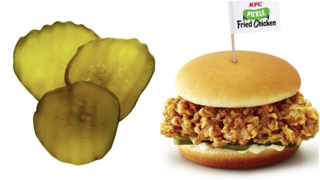 The inspiration for this sandwich from heaven came from people’s requests for more pickles on their Crispy Colonel Sandwiches, KFC said. The pickle chicken comes in tender form or shoved in between a bun.