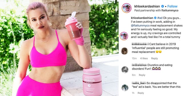 And yet, despite a whole lot of backlash, Kardashian keeps shilling for the company. In her most recent Instagram ad, she posted a picture of herself holding a Flat Tummy shake, alongside the caption: “Ok you guys… I’ve been putting in work, adding in @flattummyco meal replacement shakes and I’m seriously feeling so good. My energy is up, my cravings are controlled and I actually feel like I’m a total tummy knockout.”