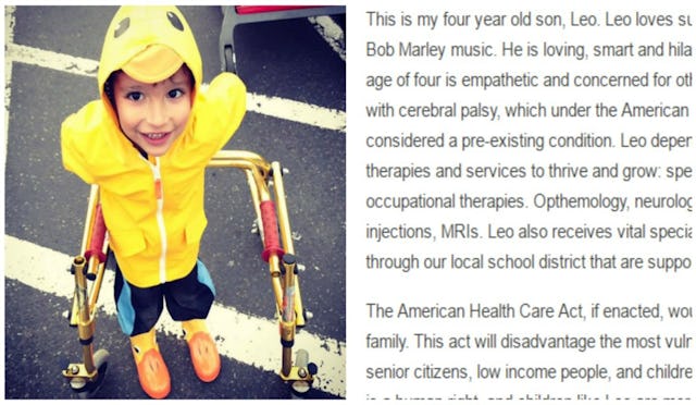 One mom is trying to change that by amplifying the voice of those with the most at stake — the children and families living with pre-existing conditions that require lifelong medical care and services. When Oregon mom Rashelle Chase heard the AHCA passed the House last week, like many of us, she was saddened, angered, and deeply concerned. But she was also terrified about what the law would mean for her son and their family. You see, Chase’s son Leo has cerebral palsy, and he relies on several critical services that are at risk under the AHCA.