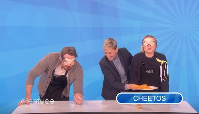 “One of you will bend over to taste the food on the plate in front of you. Then you’ll describe what you’re eating to the other person,” Ellen said to begin the show. They also cannot use their hands or use the name of the food. Cue some funny business with the blindfolds and let the games begin.