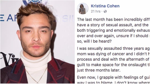 On Monday, actress Kristina Cohen joined the chorus of voices of men and women in Hollywood who are coming forward with their stories of assault and abuse. In a post on her Facebook page, Cohen accused actor Ed Westwick, best known for his role as Chuck Bass on the show Gossip Girl, of raping her in 2014.