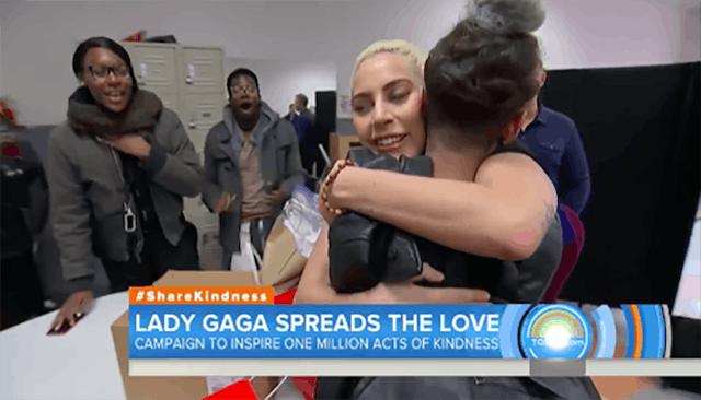 Early Monday morning, Lady Gaga joined with The Today Show and their #ShareKindness campaign to donate clothes, make-up, and other products to the Ali Forney Center for homeless LGBTQ youth in New York City.
