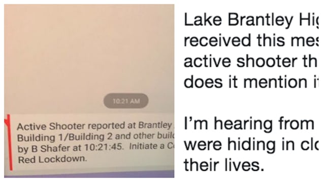 On Thursday morning, a Lake Brantley administrator got on the intercom and warned the entire student body that there was an active shooter in the school. “This is not a drill,” he said, according to TODAY. Teachers locked classroom doors, turned off the lights, and students were instructed to hide in the closets.