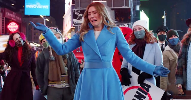 She then launches into her musical number, which is a take on Belle’s song “Bonjour” from Beauty and the Beast. Dancing around Times Square, she sings, “Hey New York / New York have you missed me? Just as much as I missed you? Pretty town, home to pretty people, and also you know who.”