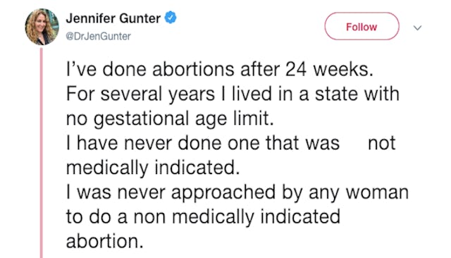 “I’ve done abortions after 24 weeks,” Gunter began. “For several years I lived in a state with no gestational age limit. I have never done one that was not medically indicated. I was never approached by any woman to do a non medically indicated abortion.”