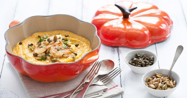 If you’re perusing the internet this morning with a Starbucks Pumpkin Spice Latte in one hand and an apple pie fall harvest candle in the other, put one of them down so you have a free hand to shop the new pumpkin-inspired collection at Le Creuset. If you’re going to commit to the holiday, you better believe you should be cooking up some butternut squash soup in one of these adorable cocottes.