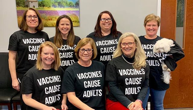 Legacy Pediatrics PA Kate Shand said she got an idea when she saw a meme and decided to turn into a t-shirt. The black t-shirts emblazoned with bold white letters in all caps, saying “Vaccines Cause Adults.” The pediatrics provider posted a picture of their team wearing the shirts on their Facebook page next to the caption “Vaccines. Save. Lives.” to combat the misinformation often found online about their side effects.