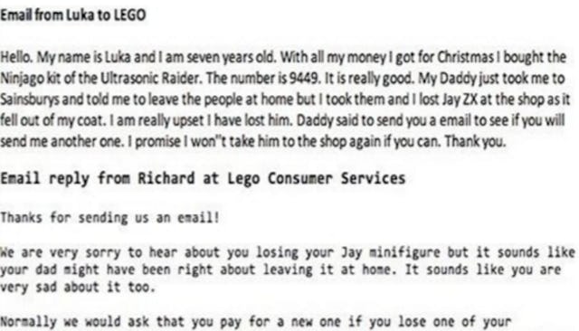 “Hello. My name is Luka and I am seven years old. With all my money I got for Christmas I bought the Ninjago kit of the Ultrasonic Raider. The number is 9449. It is really good. My Daddy just took me to Sainsburys and told me to leave the people at home but I took them and I lost Jay ZX at the shop as it fell out of my coat. I am really upset I have lost him. Daddy said to send you a email to see if you will send me another one. I promise I won’t take him to the shop again if you can. Thank you.”